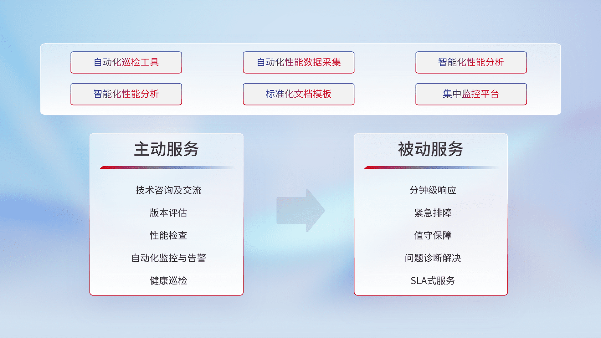 智能化工具和标准化文档,,保障服务质量,,提供主动服务(包含技术咨询、、版本评估、、性能检查、、、自动化监控与告警、、、健康巡检)和被动服务包含(分钟级响应、、、紧急排障、、值守保障、、、、问题诊断解决、、、SLA服务)。。。